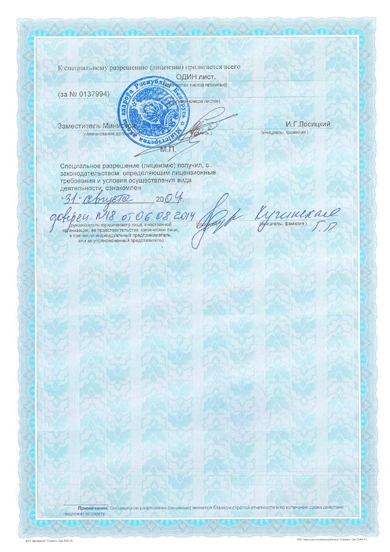 Ежегодно инжернер проходит сертификационные курсы на базе производственной площадки компании KaVo, Ivoclar Vivadet, Melag, подтверждая свою квалификацию.